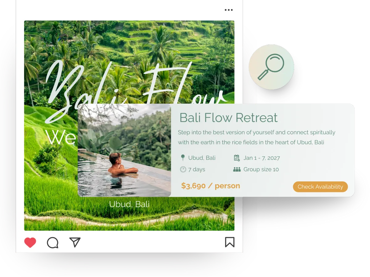 We create a beautiful 5-slide carousel Post or Reel designed to highlight all the key details of your retreat like dates, pricing, location, retreat type, and more. It’s posted from our Instagram account in collaboration with yours and boosted to a fresh new audience. These campaigns typically generate several hundred high-quality link clicks, all directed straight to your landing page. No commissions, just traffic.