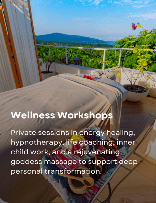 Join a private or semi-private retreat where you will find space and time to pause, heal, and connect with your inner being. You will be guided through daily yoga, meditation, and breathwork, supported by personalized life coaching, inner child work, and energy healing hypnotherapy.